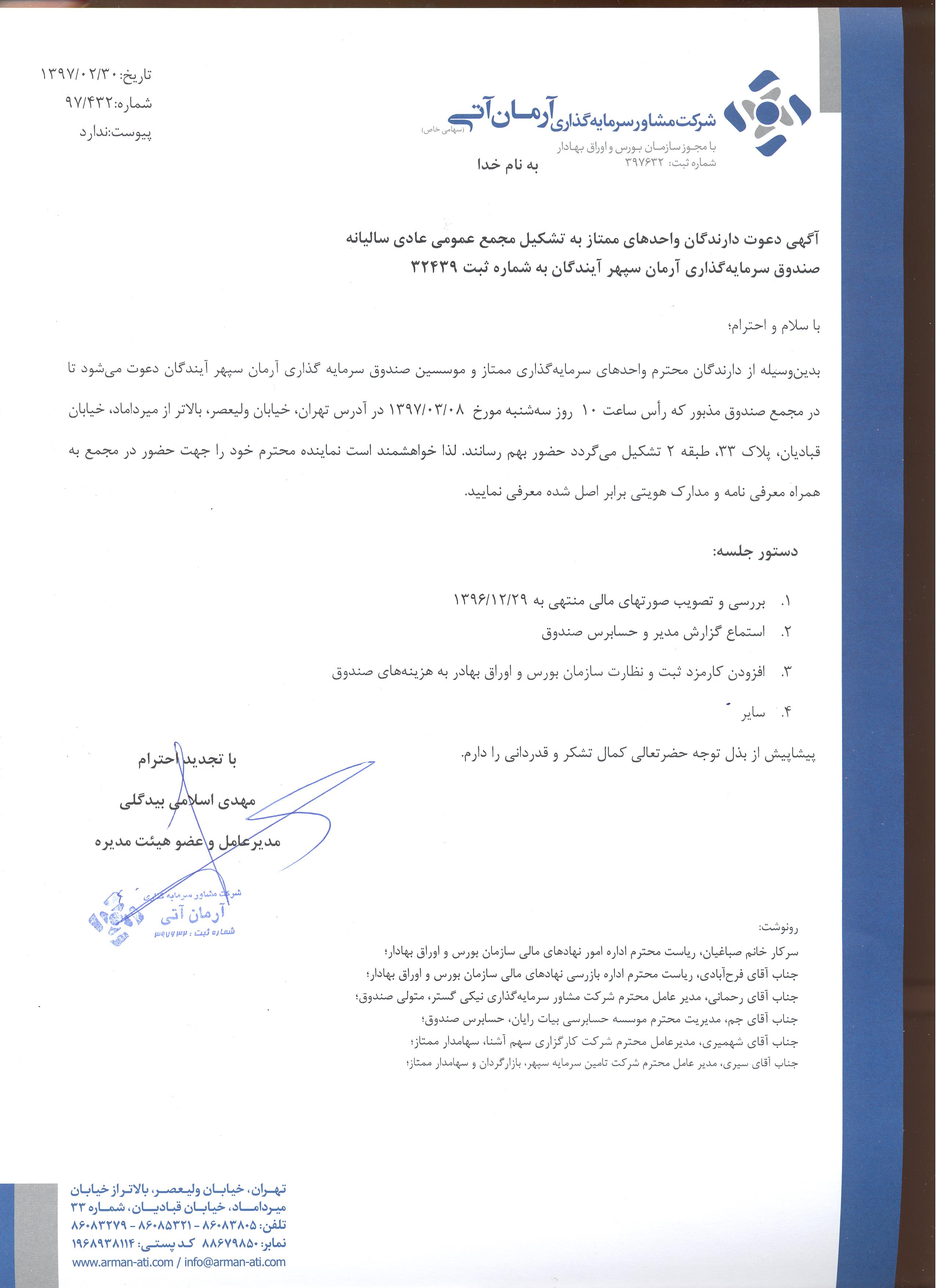 تشکیل مجمع صندوق آرمان سپهر آیندگان 1396/10/27